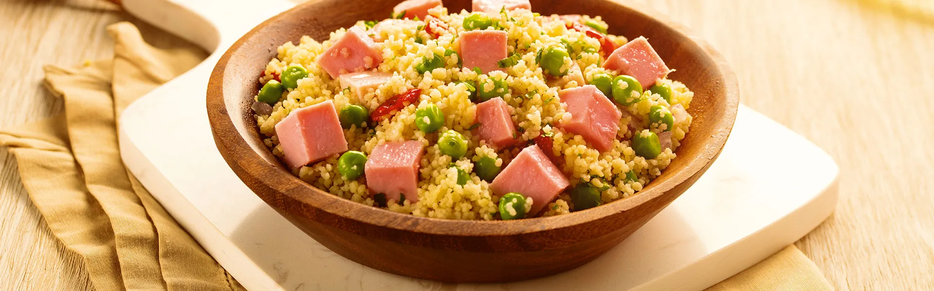 1 Em uma tigela média junte o couscous e a água quente. Tampe a tigela e deixe hidratando por 5 minutos. Com um garfo solte os grãos até que fique sem grumos maiores.