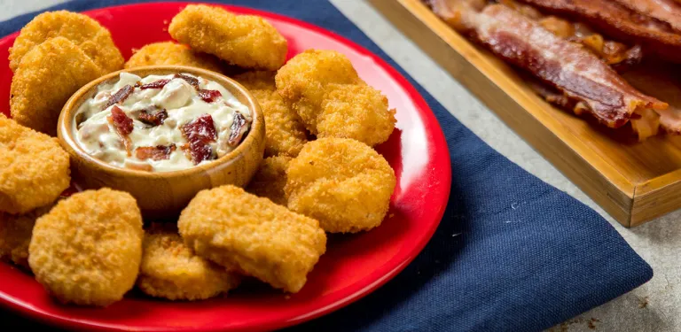 7 Retire a maionese da geladeira, tempere com sal e pimenta e adicione os pedacinhos de bacon mexendo para misturar bem.