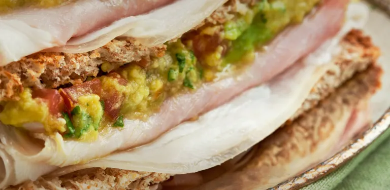 3 Pegue uma das metades do pão torrado, coloque uma fatia de presunto dobrado e uma colher de sopa da mistura de abacate. Por cima, coloque a outra metade do pão, mais uma fatia de presunto e finalize com mais uma colher do creme de abacate.