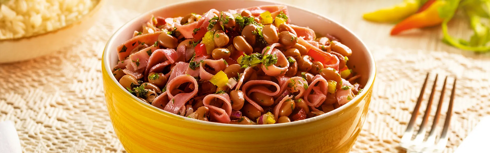 3 Em uma tigela grande, misture o feijão, a cebola roxa, o Presunto de Peru Sadia, o pimentão amarelo e o pimentão vermelho.